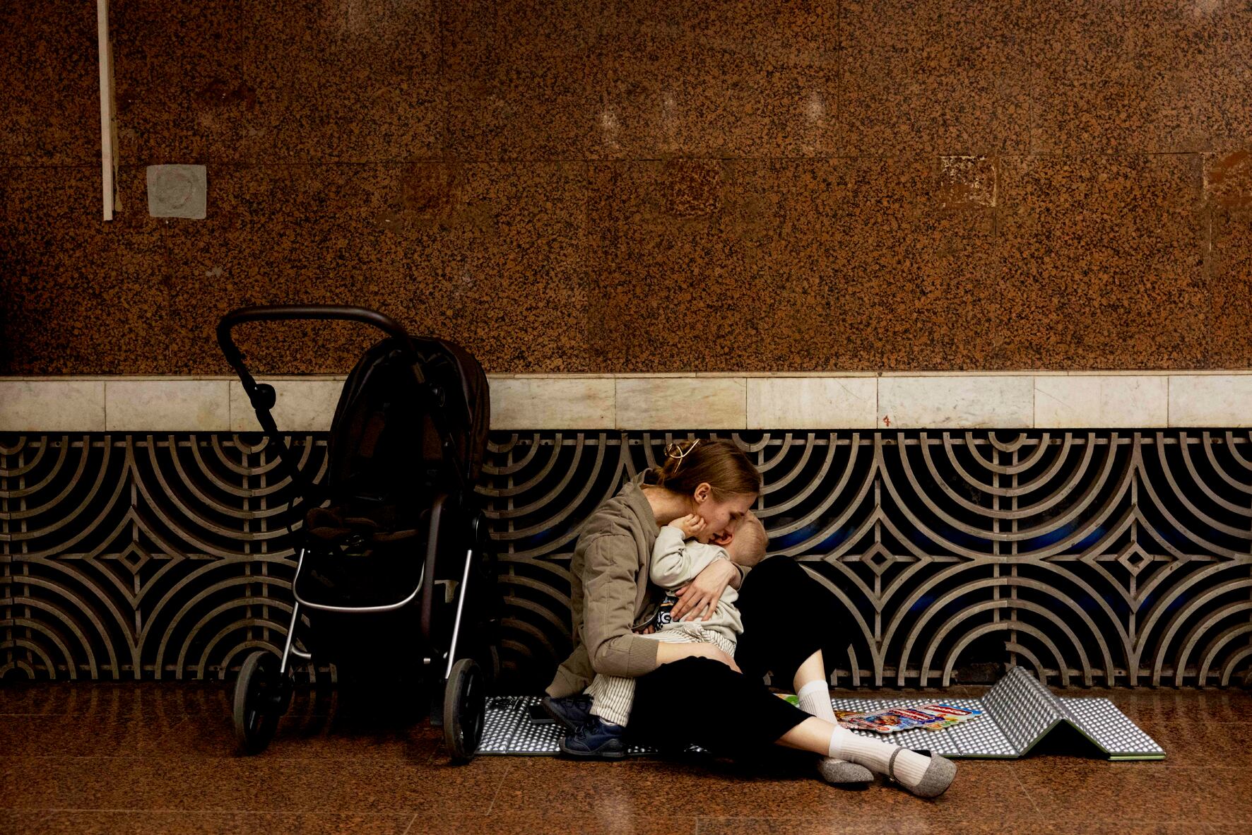Kiev, Ucrania. Una mujer, sentada sobre una colchoneta y junto a un cochecito, abraza a un niño y le murmura al oído, probablemente con palabras o una canción para calmarlo. Con su rostro cubre el del bebé, intentando que no perciba el lugar donde se encuentran. La escena es un acto de protección contra el ensordecedor ruido de las sirenas que alertan de un inminente ataque aéreo, en una estación de metro de la capital ucraniana.