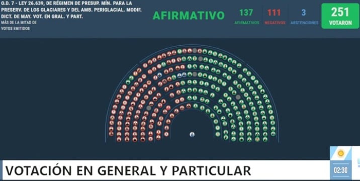 La Cámara de Diputados de la Nación aprobó este miércoles una reforma de la Ley de Glaciares. La modificación de la norma, que regula la protección de los glaciares y el ambiente periglacial, obtuvo 137 votos afirmativos, 111 negativos y 2 abstenciones.